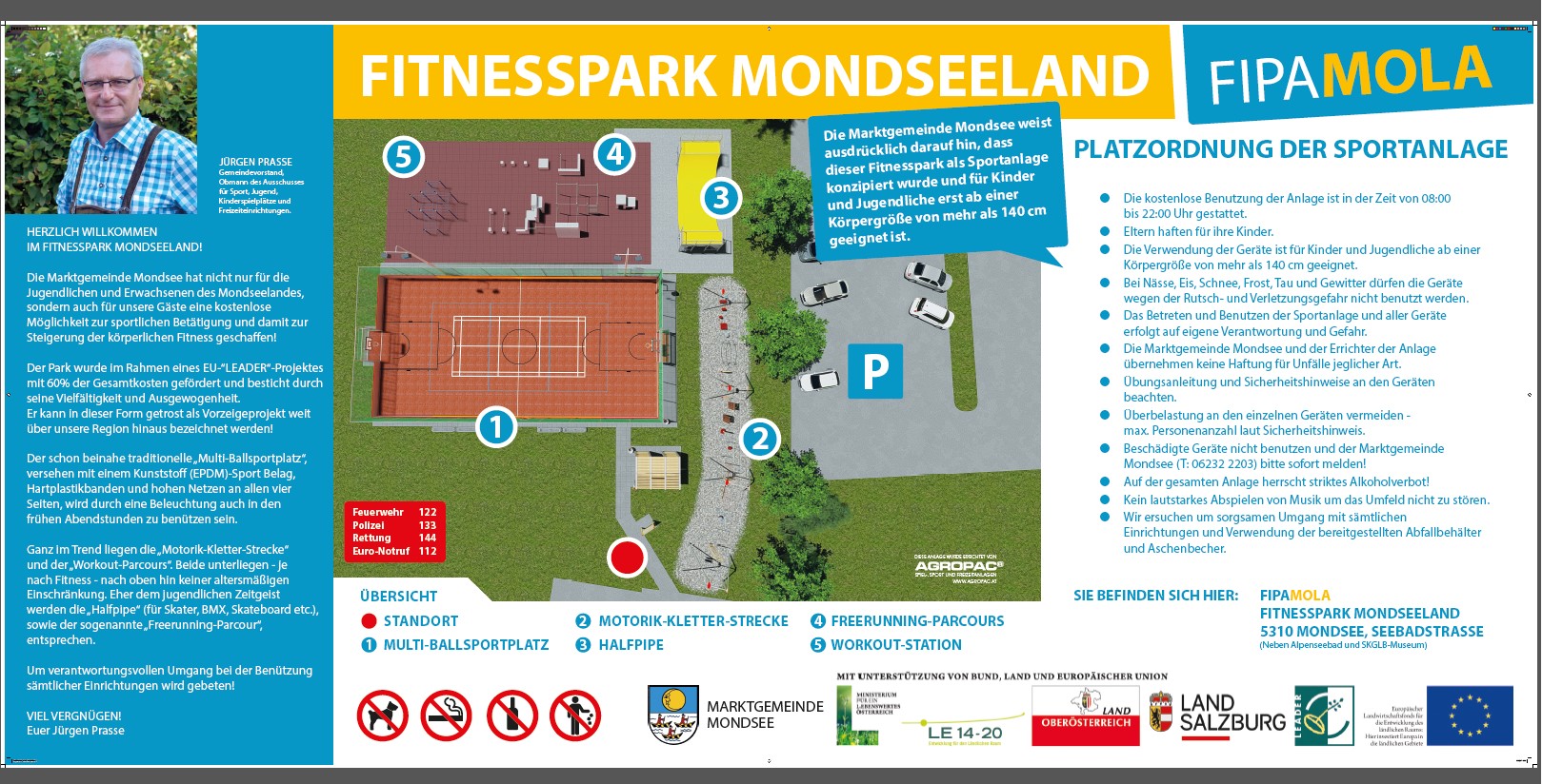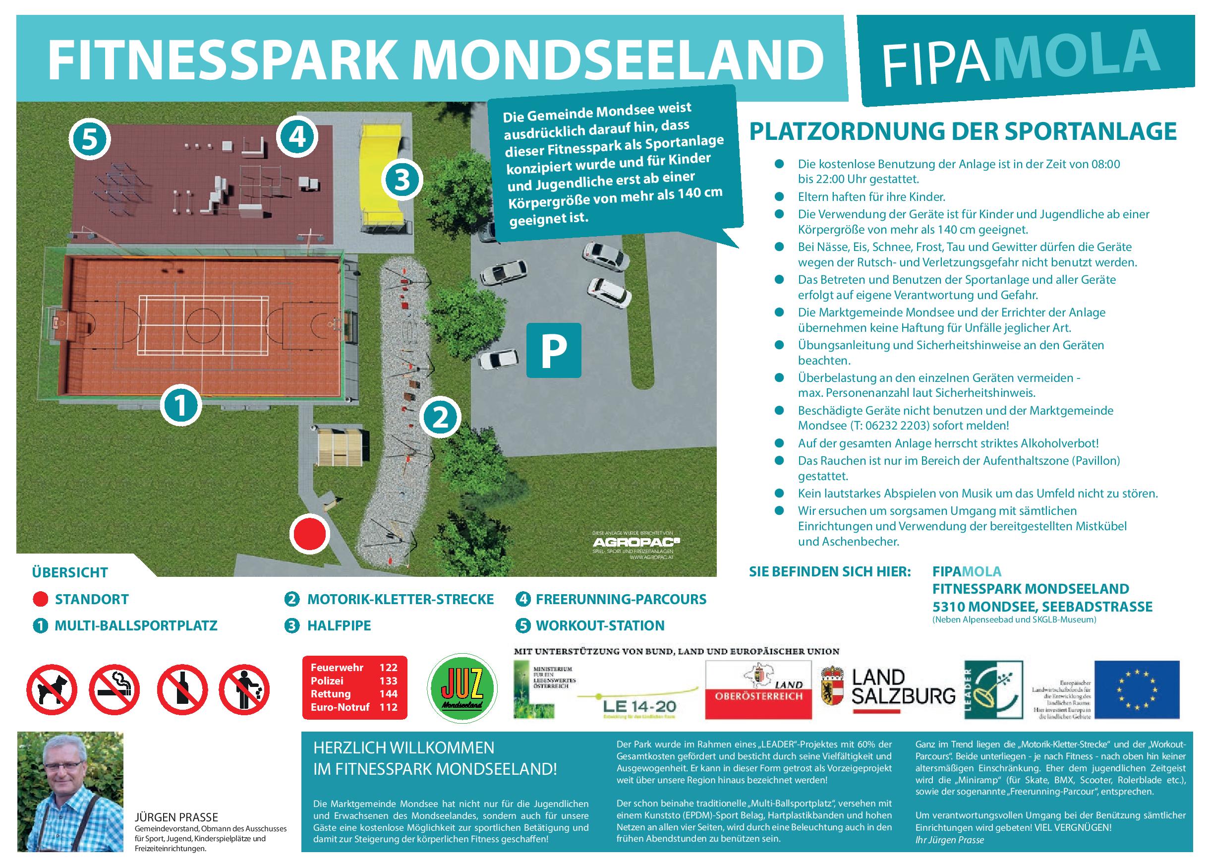 Es wurden Ideen zusammengetragen und entwickelt, unter deren Berücksichtigung ein Freizeitpark für alle Ziel- und Altersgruppen umgesetzt werden soll. Unter diesen Aspekten konnte schließlich ein Park mit Motorik-, Free-running-, Skate-, Workout- und Multiballsportplatzelementen in der Marktgemeinde Mondsee errichtet werden.