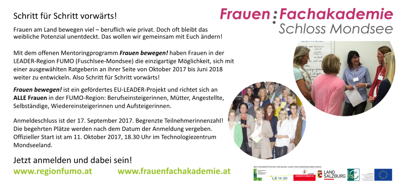 Das überparteiliche und überkonfessionelle Projekt richtet sich speziell an Frauen aus der LEADER Region FUMO – Fuschlsee-MondSeeLand, die anderweitig (durch Vereine, polit. Parteien, firmenintern) keinen Zugang zu einem Mentoringprogramm haben.