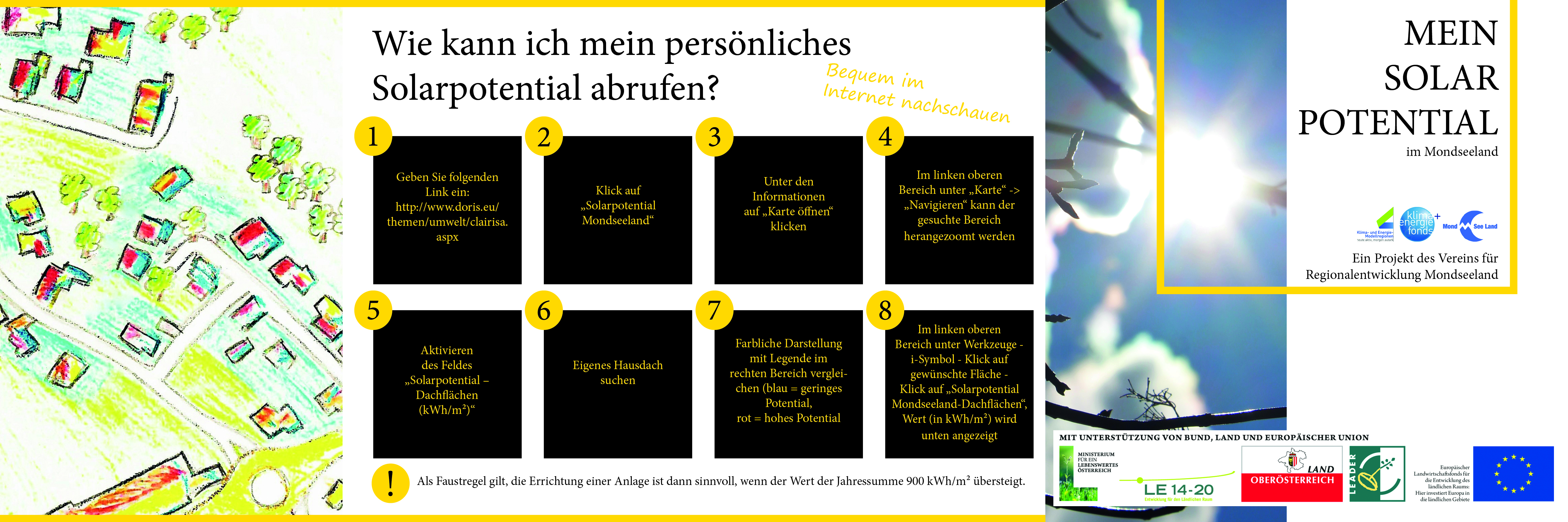 Weltweit bisher einzigartige Verfahren und Methoden konnten vonseiten österreichischer ExpertInnen im Bereich der Erstellung von Solarkatastern/Solarpotential entwickelt werden. Beispiele sind landesweite Ableitungen von Gebäudemodellen aus Laserscanningdaten und deren Nutzung, großflächige Erstellung von Solarkatastern für Gebäudefassaden, Berechnung des Solarpotentials von Dachflächen auf Basis hoch aufgelöster Oberflächenmodelle und noch weitere höchst komplexe Anwendungsfelder und Berechnungsmethoden. Einige Gebiete in Österreich haben es bereits vorgemacht: Die Bundesländer Tirol, Vorarlberg und Kärnten sowie auch der Bezirk Osttirol, Landeck oder auch die Stadt Innsbruck sowie auch Bereiche in der Schweiz oder in Deutschland können als Vorreiterregionen und Referenzprojekte angeführt werden. Der Start der Initiativen ging nicht selten von kleineren räumlichen Ebenen aus - für die schließlich flächendeckende Berechnung des Land Salzburg beispielsweise etablierte sich der Regionalverband Salzburger Seenland als die treibende Kraft. Auch Energieinstitute, Regionsmanagements, LEADER Regionen, Ämter der Landesregierung oder Kommunalbetriebe konnten durch viel Engagement die zum Teil überregionalen Analysen realisieren.Die KEM Mondseeland und LEADER-Region FUMO - als grenzübergreifende Region - setzten sich zum Ziel, das zu einem bereits großen Flächenanteil vorhandene Solarpotential der nutzbaren Flächen in den Salzburger Gemeinden mit jenem des Mondseelandes zu ergänzen. Diese wertvolle Information sollte dabei in die Öffentlichkeitsarbeit einfließen und für BürgerInnen transparent und leicht verständlich dargelegt werden (z.B. in Gemeinden aufliegend, Vorführung im Rahmen einer Informationsveranstaltung). Erstmalig in Oberösterreich (bis auf die Landeshauptstadt Linz) konnte diese Maßnahme umgesetzt werden, wodurch die Region als Pilotregion für das Bundesland gesehen werden kann.