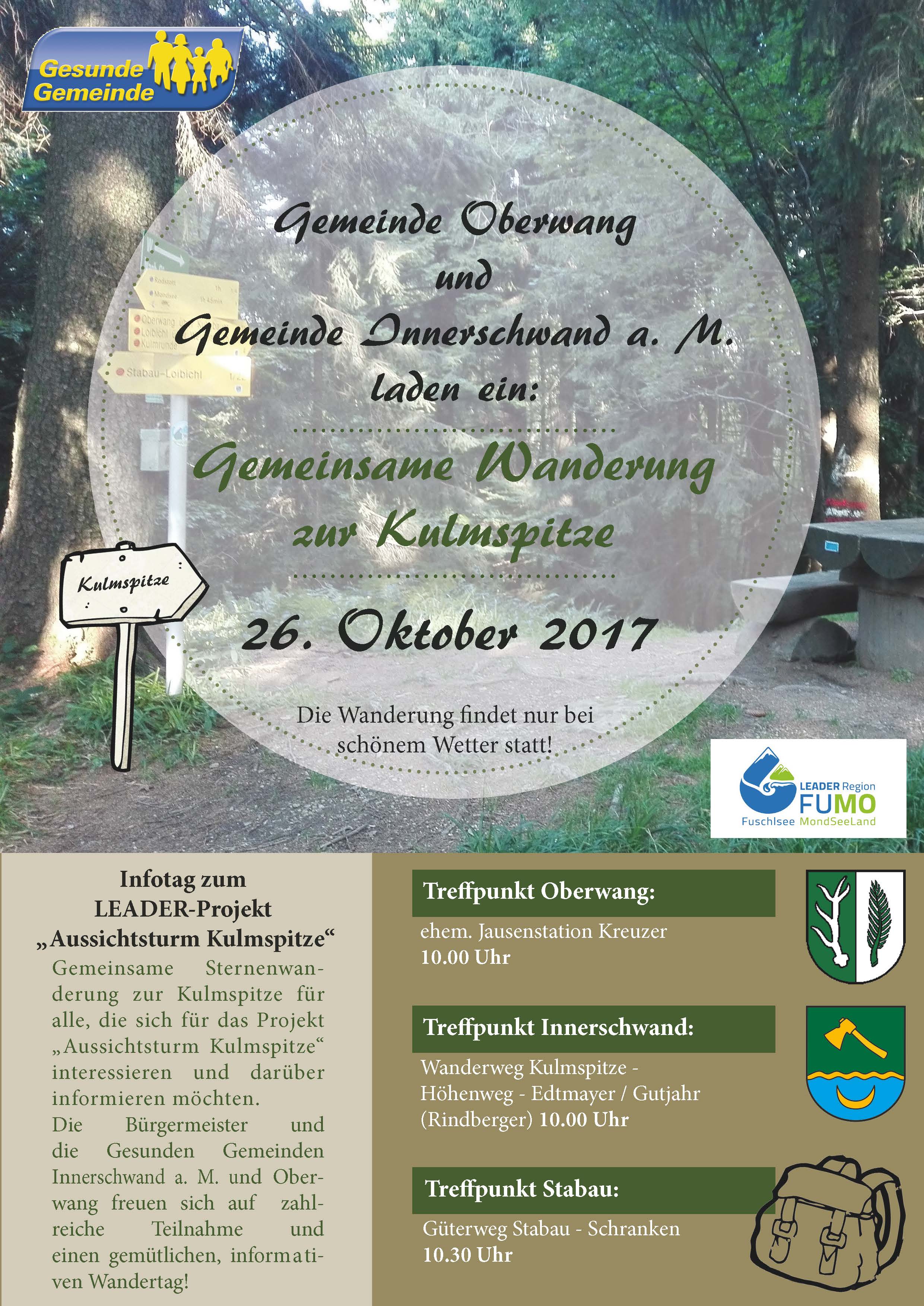 Die Region Fuschlsee - Mondseeland gilt als beliebtes Wandergebiet für Jung und Alt. Am Rande der Alpen situiert, bietet es sowohl ansprechende alpine Bergtouren als auch leichte Familienwanderungen über sanfte Höhenzüge und ist somit interessant für Touristen aller Art. Auf die Kulmspitze führen gut begehbare Wanderwege aus 3 Gemeinden des Mondseelandes (Oberwang, Tiefgraben, Innerschwand), somit ist die Bergspitze für viele Zielgruppen gut erreichbar. Mit einer Höhe von 1100 Metern gibt ein sich auf dem höchsten Punkt befindlicher Aussichtsturm den Blick auf das gesamte FUMO Region frei und steigert so die Attraktivität dieser Wanderwege erheblich, sowohl für Touristen als auch für die Bevölkerung des Mondseelandes. Einen zusätzlichen Anreiz, diesen Turm zu errichten, stellten historische Aufzeichnungen dar, aus welchen hervorgeht, dass es einen Turm auf der Kulmspitze bereits um 1875 gab und dieser schon damals ein beliebtes touristisches Ausflugsziel war, welcher jedoch aufgrund fehlender Geldmittel nicht erhalten werden konnte. Diese sowie auch die Tatsache, dass es in der FUMO Region keine vergleichbare Attraktion gibt, machen das Projekt einzigartig.