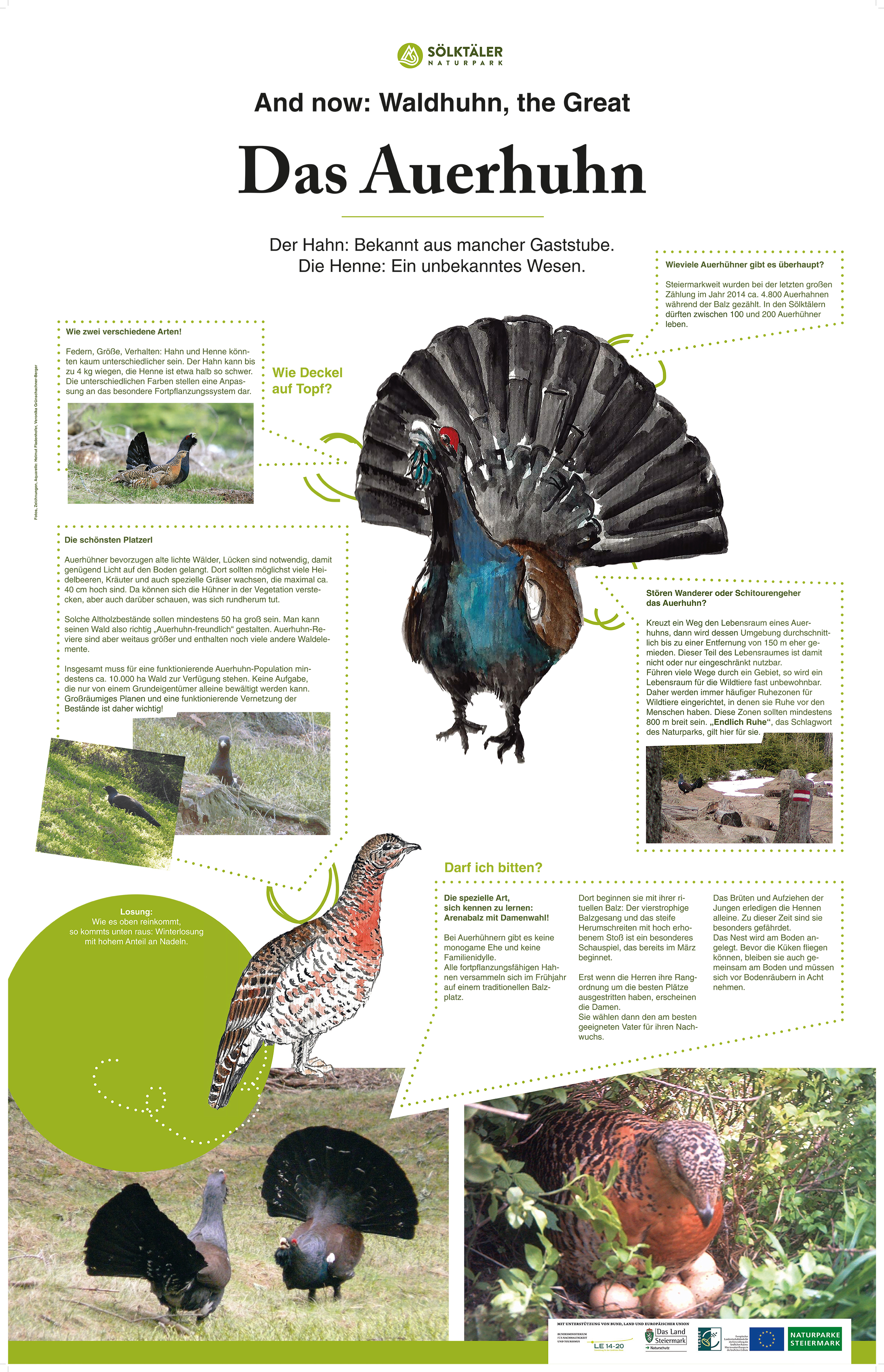 Die Ausstellung "Die wilden Hühner der Sölk" wurde im Naturparkhaus Schloss Großsölk präsentiert. Das Ziel der Ausstellung war es, Raufußhühner, ihre Lebensweisen und Bedürfnisse einer breiteren Bevölkerung zugänglich zu machen. Derzeit sind diese Vogelarten nur von vielen Großprojekten und anderen alpinen Nutzungen bekannt, wo sie aus Naturschutzgründen immer wieder als „Verhinderer“ von Projekten angesehen werden. Die Ausstellung hatte daher zum Ziel, die Lebensweise, Verbreitung, die Bedürfnisse, Gefährdungen und Schutzmöglichkeiten dieser vier Vogelarten vorzustellen. In den Sölktälern sind alle viel österreichischen Arten noch in relativ großer Zahl vorhanden: Auer-, Birk- Hasel und Schneehuhn sind auch Schutzgüter des Natrua 2000 Schutzgebietes Niedere Tauern. Daher ist der Naturpark Sölktäler als Ausstellungsort sehr gut geeignet.Ausgangssituation