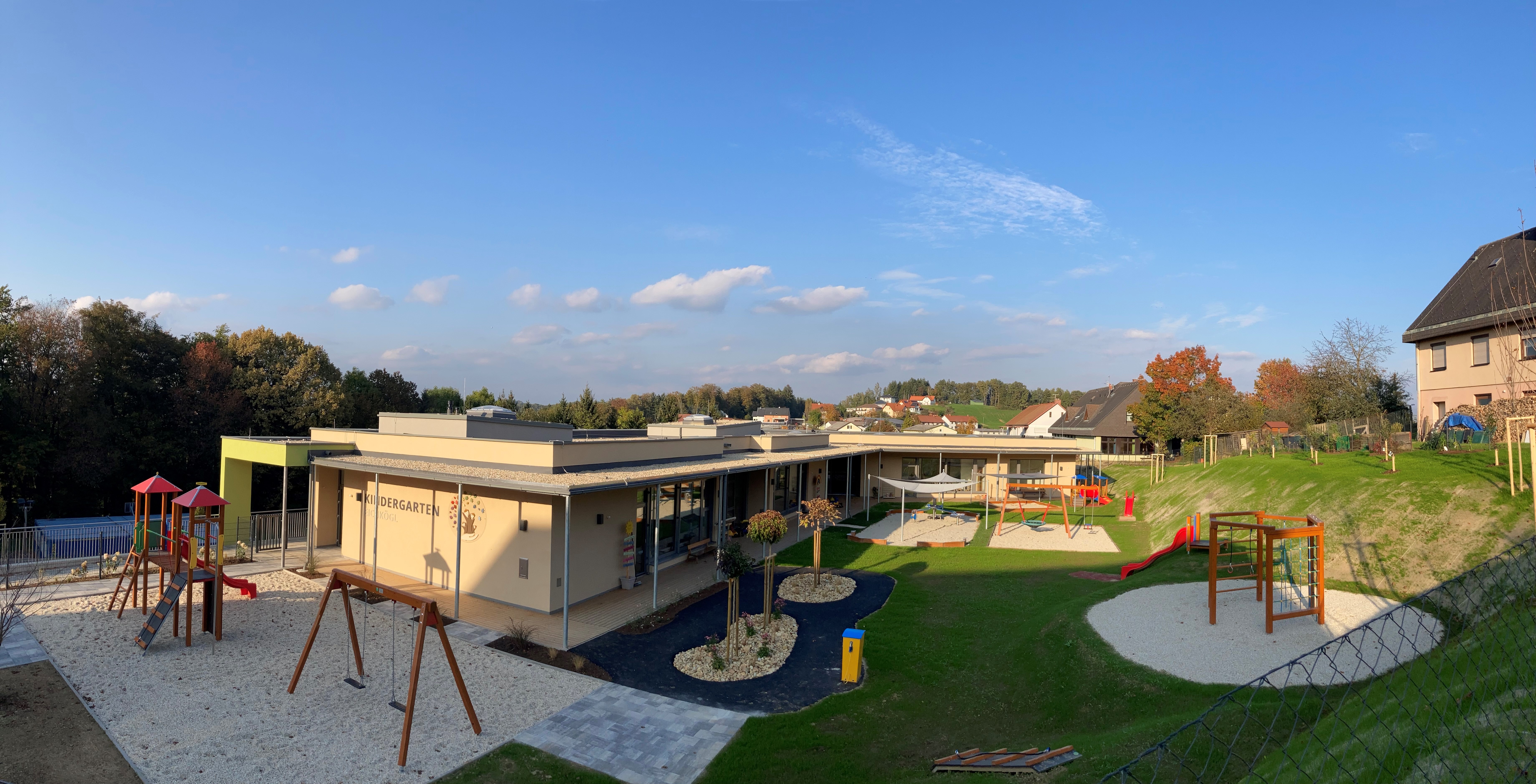 Inhalt des Projekts ist der Neubau eines 2-gruppigen Kindergartens, der dringend notwendig war aufgrund des Platzmangels im alten Kindergarten der wachsenden Gemeinde. Im Rahmen des Gesamtvorhabens wurde zusätzlich eine 1-gruppige Kinderkrippe im gemeinsamen Gebäude umgesetzt.Ausgangssituation